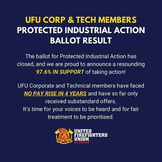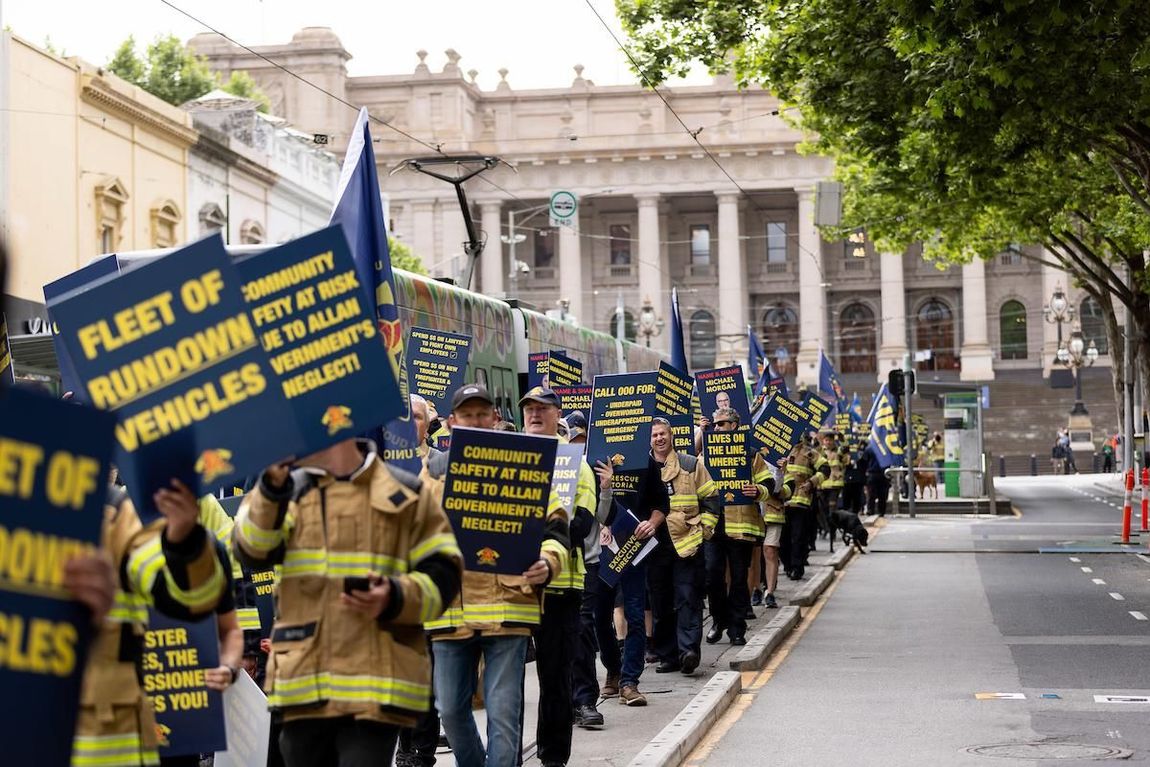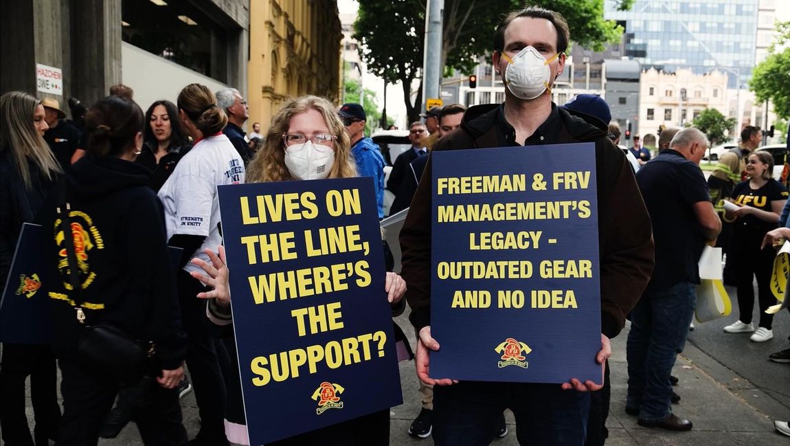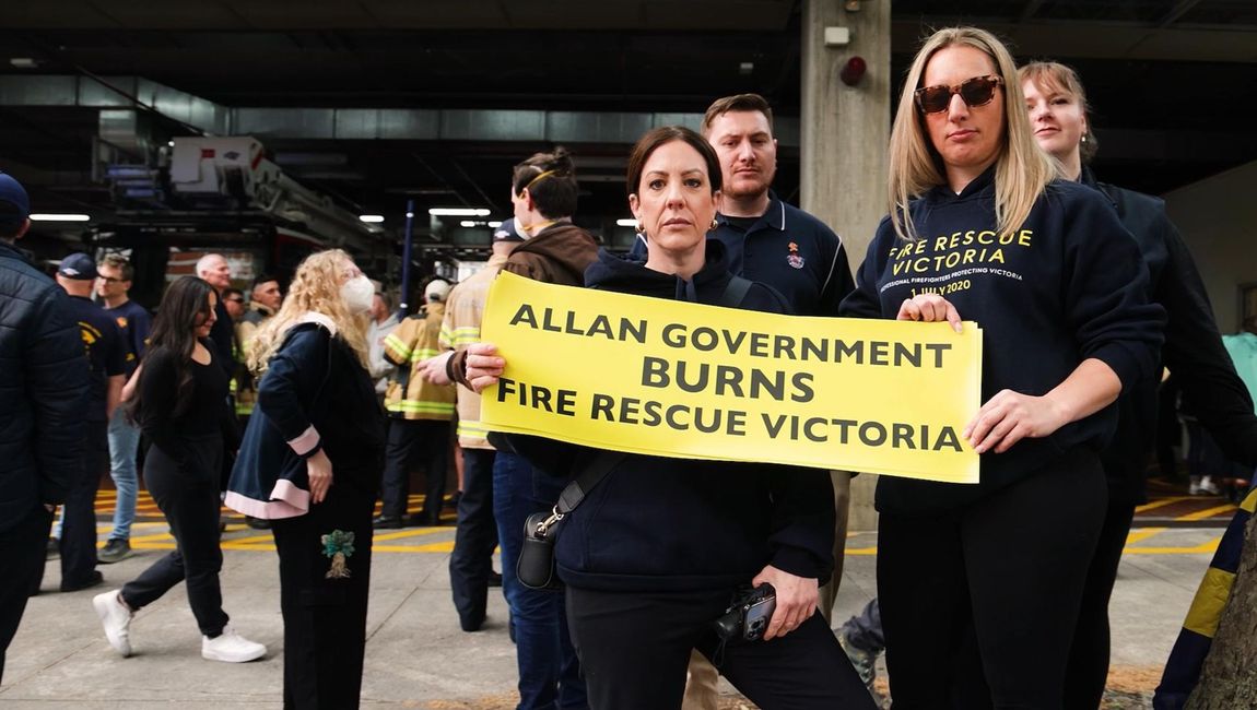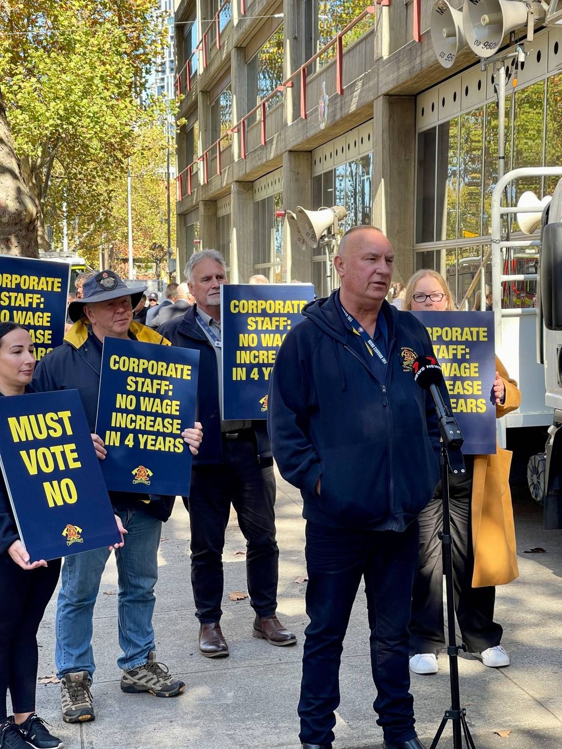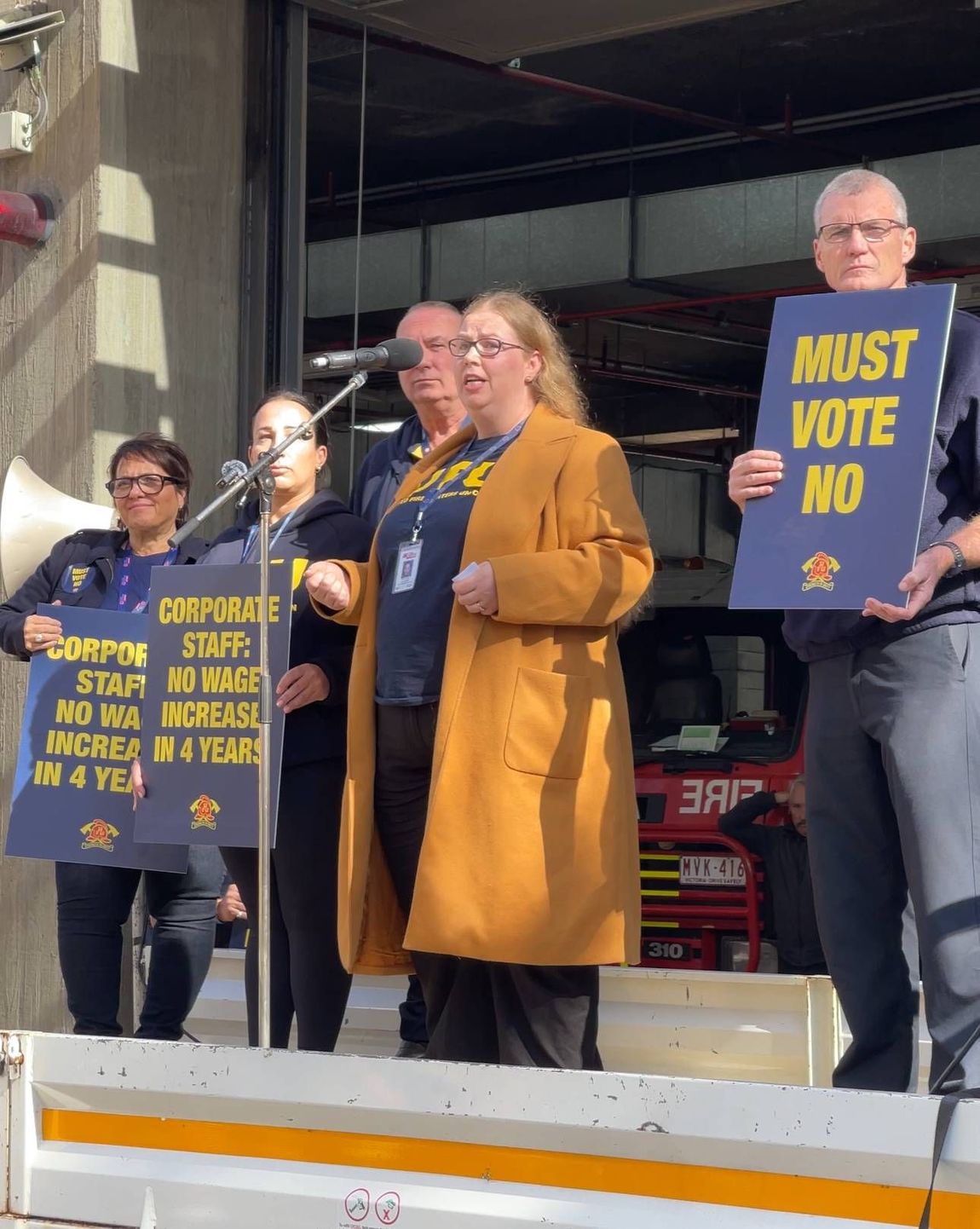 CORPORATE, TECHNICAL, AND ADMINISTRATIVE WORKERS FROM FIRE RESCUE VICTORIA TAKE PART IN MASS MEETING/WORK STOPPAGE TO PROTEST THEIR EMPLOYER THREATENING A NON-UNION EBA